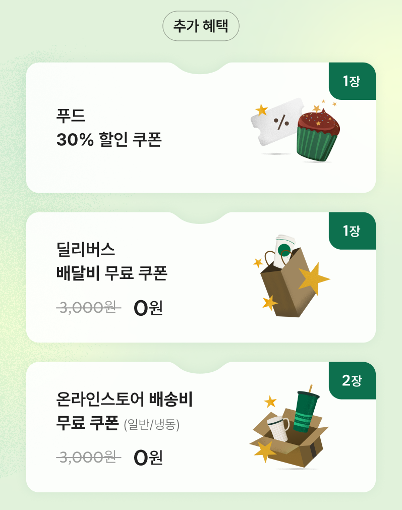 기본 혜택 외 추가 혜택도 있습니다. 푸드 30% 할인 쿠폰 제공, 딜리버스 무료 배달 쿠폰, 온라인 스토어 무료 배송 쿠폰(일반/냉동)도 제공이 됩니다. 발급일로부터 30일 안에 사용하면되는 혜택입니다.