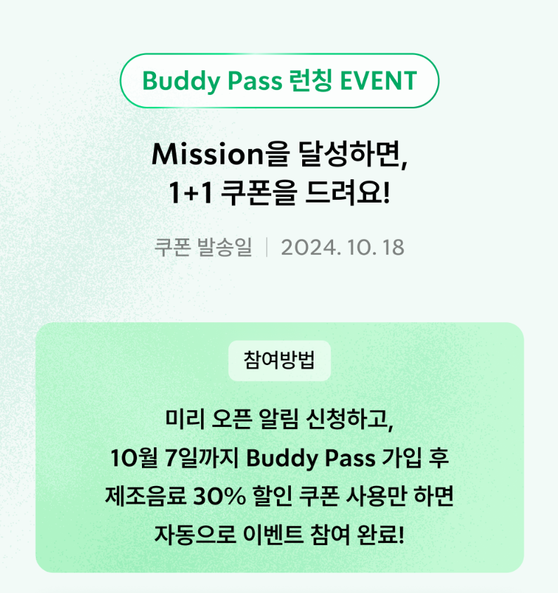 2024년 10월 1일에 오픈되는 스타벅스 구독서비스 '버디패스'는 기본 혜택으로 30일간 매일 30%의 혜택을 누릴 수 있습니다.