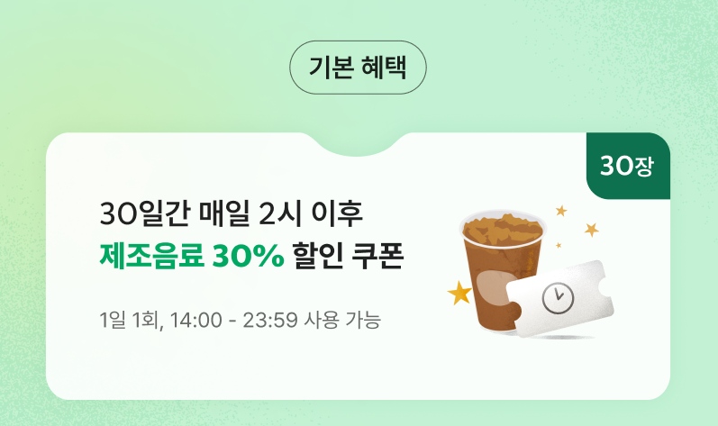 제조 음료 30% 할인 쿠폰의 경우 리저브 음료, To Go Bag, 알코올 음료, 프로모션 음료, 유료 퍼스널 옵션 등 일부분은 할인이 제외된다고 하는데요. 이용 전에 앱이나 매장에서 해당 조건을 확인하는 것이 좋습니다.