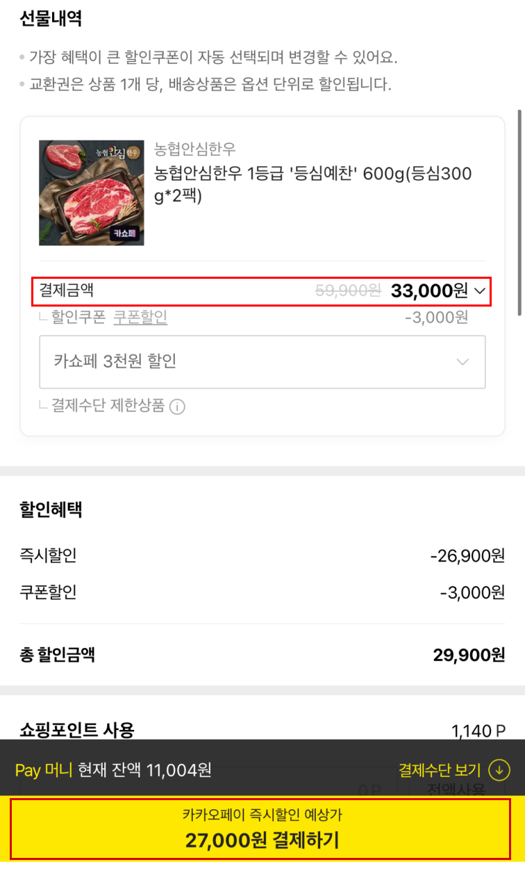 예시로, 안심한우 600g 짜리가 기존 판매가는 33,000원인데 카쇼라 쿠폰과 함께 카카오 페이로 구매하니 27,000원이네요!