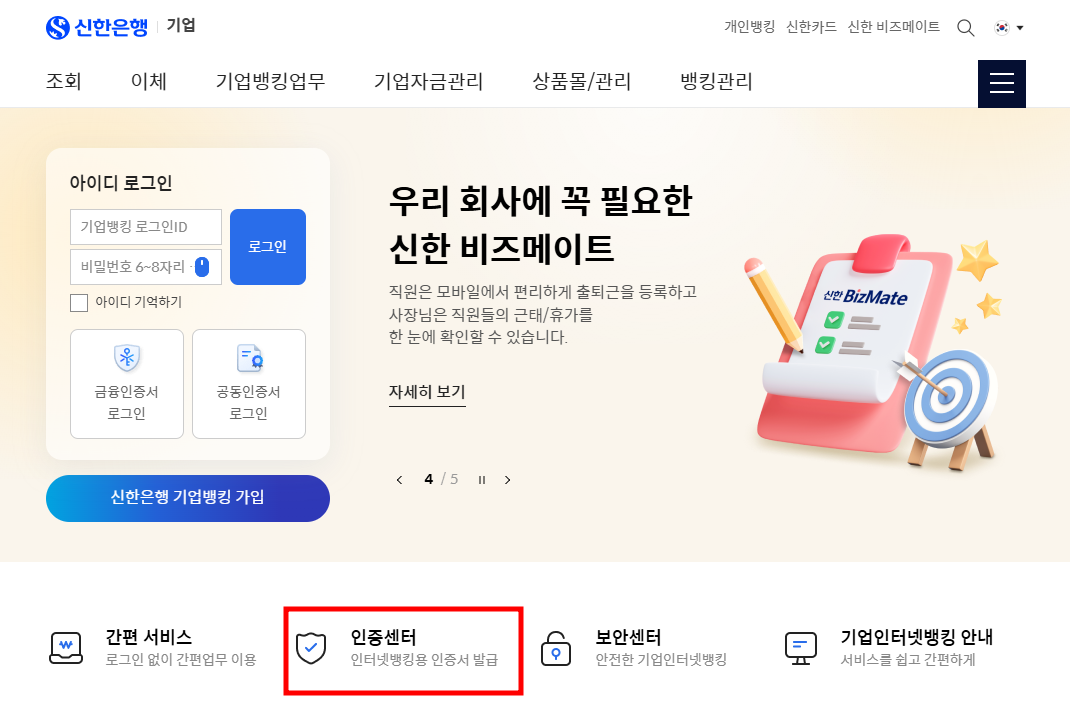 은행 사이트에 접속한 뒤, 인증 센터를 찾아야 해요.